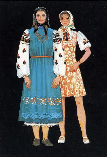Сільські дівчата все ще носили довгі сорочки, а на пояс зав’язували плахту, запаску, взували взуття: постоли або чоботи.